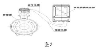 工業水處理流量計是由流量傳感器和轉換器(也叫顯示器)兩大部分組成。測量管上下裝有激磁線圈,通激磁電流后產生磁場穿過測量管,一對電極裝在測量管內壁與液體相接觸,引出感應電勢,送到轉換器。激磁電流則由轉換器提供。如圖2所示: