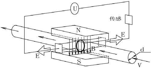 如圖,測量流量時,流體流過垂直于流動方向的磁場,導電性流體的流動感應出一個與平均流速成正比的電勢。其感應電壓信號通過兩個電極檢出,并通過電纜傳送至轉換器,經過信號處理及相關運算后,將累計流量和瞬時流量顯示在轉換器的顯示屏上。