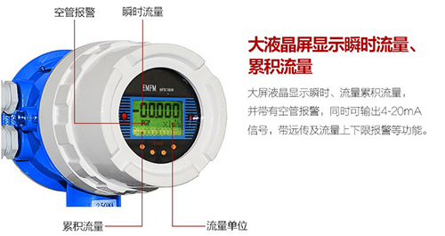 11、高清晰度LCD背光顯示瞬時流量,累積流量(∑+、∑-、∑D)、流速、流量百分比、流量狀態(tài)(勵磁、流量、空管)等。