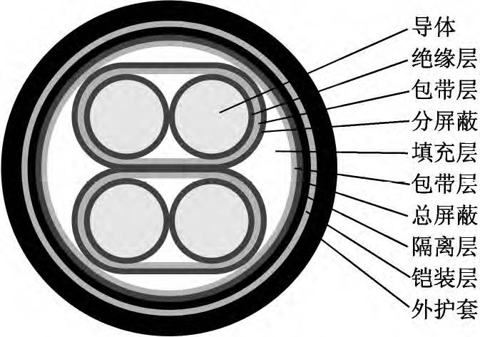 該新型電纜的結(jié)構(gòu)如圖1所示。導(dǎo)體為單股退火鍍錫軟銅線(xiàn),以提高導(dǎo)體的導(dǎo)電性和防腐蝕性。在導(dǎo)體外繞包一層薄F4(聚四氟乙烯)半導(dǎo)電帶,有利于降低導(dǎo)體和絕緣之間的摩擦起電噪音。絕緣采用材料較為純凈、介電常數(shù)較小、具有一定彈性的聚丙烯絕緣級(jí)材料,并采用擠壓式擠出,減小絕緣層與導(dǎo)體的間隙。采用對(duì)絞組作為信號(hào)傳輸線(xiàn),由于在兩根傳輸線(xiàn)上感應(yīng)的電壓接近相等,減小了電壓差值,提高了信號(hào)傳輸穩(wěn)定性;對(duì)絞組由兩種不同顏色絕緣線(xiàn)芯組成,相鄰線(xiàn)對(duì)對(duì)絞節(jié)距應(yīng)不大于100mm。對(duì)絞分屏蔽組(即對(duì)對(duì)絞組進(jìn)行分屏蔽,每對(duì)對(duì)絞組外繞包兩層聚酯帶和一層厚0.04mm鋁塑復(fù)合帶繞包,內(nèi)置一根7×0.26mm鍍錫銅絞線(xiàn)作引流線(xiàn))有利于對(duì)不同對(duì)絞組之間信號(hào)串音的抑制和隔離。對(duì)絞分屏蔽組同心式絞合成纜,在對(duì)絞分屏蔽組間填充非吸濕性材料,以保證纜芯圓整。在成纜纜芯外繞包兩層聚酯帶,再采用鋁塑復(fù)合帶繞包,內(nèi)置鍍錫銅線(xiàn)作引流線(xiàn),以提高電纜電磁屏蔽能力。總屏蔽層外擠包隔離層(隔離護(hù)套),隔離層采用絕緣級(jí)低密度聚乙烯材料。隔離層外采用鎧裝層,鎧裝材料為高導(dǎo)磁合金鋼帶,其為強(qiáng)磁材料,可將外來(lái)的磁通大部分限制在鎧裝層的外表面上(僅有少部分能進(jìn)入被屏蔽的空間);鎧裝時(shí)對(duì)高導(dǎo)磁合金鋼帶采用縱包焊接,確保其形成一連續(xù)圓柱管;鎧裝層可提高電纜抗電磁干擾水平以及對(duì)電纜進(jìn)行加強(qiáng),減少電纜振動(dòng)引起的電動(dòng)勢(shì)。外護(hù)套采用藍(lán)色軟PVC(聚氯乙烯)護(hù)層級(jí)電纜材料擠包,實(shí)現(xiàn)電纜防護(hù)。