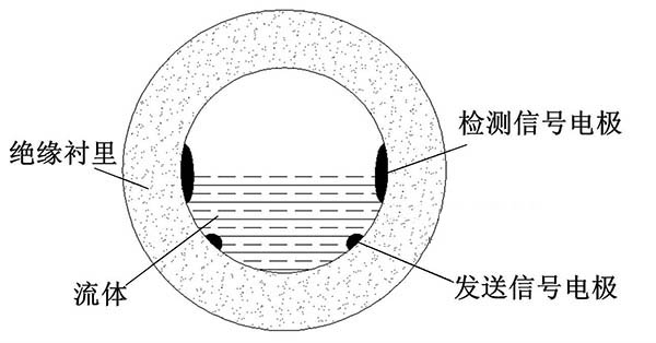 ③利用阻抗或信號衰減研制的非滿管一寸管污水流量計。這種結構的非滿管一寸管污水流量計是當前國內研究的方向之一。其結構是流量管底部貼一對信號發射電極,在流量管中間貼信號接收電極。由于信號在流體中傳播會產生衰減,且傳播時間越長,衰減越多,因此通過信號接收電極接收到的信號衰減量即可得知液面高度;同時該電極還能測量流體切割磁感線產生的電動勢,以此達到測量非滿管流量的目的。阻抗式或信號衰減非滿管一寸管污水流量計結構簡圖如圖5所示。