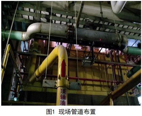 考慮兩臺機(jī)組管線布置和運行狀態(tài)完全一致, 下面僅提供#1機(jī)組的測量分析。圖1中頂軸油管上 部水平管道為凝結(jié)水補(bǔ)水管道。