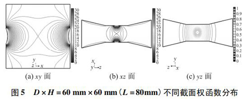 4) 圖 3( c) 、圖 4( c) 的 yz 面權函數分布表明,D = 90 mm時的權函數等勢線間距略大于 D = 60 mm 時的權函數等勢線間距,權函數變化梯度較小,且中心區域的權函數等勢線逐漸變為直線,因此 D = 90 mm 的權函數分布更均勻一些,但是兩者區別很小,即寬度改變對 yz 面權函數分布影響很小。圖 4( c) 、圖 5( c) 的 yz 面權函數分布表明,H = 30 mm時的權函數等勢線間距較大,且中心區域的權函數等勢線逐漸變為直線,因此 H = 30 mm 的權函數分布更加均勻;