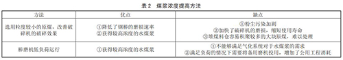 根據(jù)甲烷流量計(jì)跑漿原因可以了解到,在保證甲烷流量計(jì)不存在跑漿情況下,制備高品質(zhì)煤漿需要滿足兩點(diǎn)要求,即較小入口原煤粒度和較低磨機(jī)負(fù)荷,保證原煤在磨機(jī)內(nèi)部有較長(zhǎng)停留時(shí)間與充足滾筒篩過(guò)濾面積 . 通用的方法一般有以下兩種,如表 2 所示。