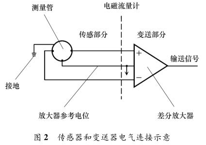 防腐型電磁流量計(jì)主要由兩部分組成:流量傳感器和信號(hào)變送器,如圖 2 所示。傳感器上的勵(lì)磁線圈接受變送器傳輸來的勵(lì)磁電流產(chǎn)生磁場,輸出感應(yīng)電動(dòng)勢信號(hào);信號(hào)變送器則將感應(yīng)電動(dòng)勢信號(hào)轉(zhuǎn)換為流量信號(hào)或模擬量信號(hào)送至控制系統(tǒng)。防腐型電磁流量計(jì)按組成方式分為一體式和分體式。防腐型電磁流量計(jì)穩(wěn)定工作另外一個(gè)重要條件是接地。當(dāng)流體流動(dòng)穿過磁場時(shí),以導(dǎo)電流體本身作為參考電位,在測量管一側(cè)電極產(chǎn)生正電勢,另一側(cè)產(chǎn)生負(fù)電勢,形成電勢差。但此電動(dòng)勢信號(hào)一般只有幾毫伏,易受外界干擾。為防止干擾,將參考電位接入大地作為零電位,保證傳感器輸出精確穩(wěn)定的信號(hào)。傳感器和轉(zhuǎn)換器的接地端必須與被測介質(zhì)同電位,才能構(gòu)成對(duì)稱的輸入輸出回路。