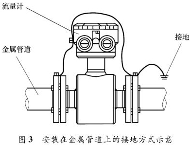 防腐型電磁流量計(jì)安裝在金屬管道上,安裝時(shí)將金屬管道與防腐型電磁流量計(jì)相連接,接地線再接入接地網(wǎng),如圖 3 所示。