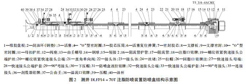 如圖 2 所示,DLFP14 - 70T 注脂防噴盒有 1 個(gè)注脂口、1 個(gè)回脂口、1 個(gè)防噴盒液控口、1 個(gè)刮纜器液控口及1 個(gè)溢流口,主體內(nèi)裝有 6 根阻流管。DLFP14 - 70T 注脂防噴盒采用 4 級密封: * 1 級密封采用注脂密封,撬裝注脂泵從注脂口注入高壓高粘度密封脂于 6 根阻流管與電纜間隙; * 2 級密封采用液壓密封,氣動液壓泵主加壓和手壓泵補(bǔ)加壓結(jié)合從防噴盒液控口注入液壓油,推動活塞擠壓膠芯壓筒; * 3 級密封采用液壓密封,手壓泵加壓從刮纜器液控口注入液壓油,推動活塞擠壓膠芯壓筒實(shí)現(xiàn)密封和刮油作用; * 4 級密封油杯、橡膠盤根和刮油環(huán)( 鋼 墊) 。DLFP14 - 70T 注脂防噴裝置配有液控上、下捕捉器、液控雙閘板防噴器和放噴組件,根據(jù)實(shí)際可以調(diào)整溢流量,實(shí)現(xiàn)零溢流密閉測井施工。 DLFP14 - 70T 注脂防噴裝置工作壓力 70 MPa,耐壓105 MPa。