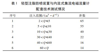 在實(shí)際應(yīng)用中,使用輕型注脂防噴裝置與內(nèi)流式集流智能型渦輪流量計(jì)配套技術(shù)對喇叭口在射孔層上注聚井進(jìn)行測試。輕型注脂防噴裝置與內(nèi)流式集流智能型渦輪流量計(jì)配套技術(shù)施工工藝參見文獻(xiàn),測試情況見表 1 所示,低注入量井( ≤10 m3 /d) 占到 56. 60% 。