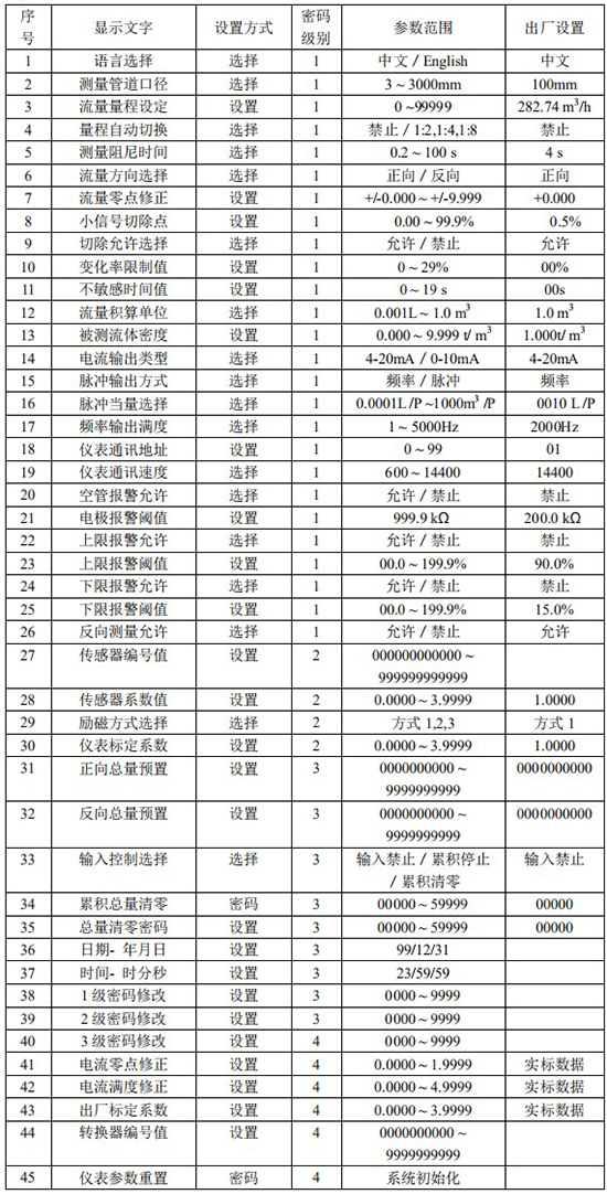 儀表參數設置功能設有 5 級密碼。其中,0~3 級為用戶密碼,* 4 級為制造廠密碼。用戶可使用* 4 級密碼來重新設置* 1~3 級密碼。另外,還設有總量清零密碼專門用于累計計數回零。
