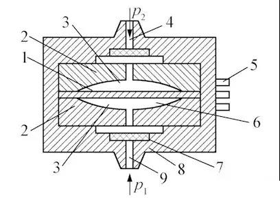 1—金屬膜片(動極);2—凹玻璃圓盤;3—金屬鍍層(定極);4—低壓側導壓口;5—輸出端子;6—空腔;7—過濾器;8—殼體;9—高壓側導壓口