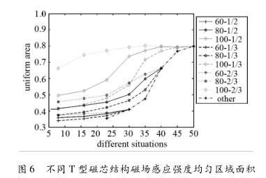 如圖6所示為不同T型磁芯結(jié)構(gòu)下測(cè)量區(qū)域磁場(chǎng)感應(yīng)強(qiáng)度均勻區(qū)域面積,圖中橫坐標(biāo)為T型磁芯b的角度,縱坐標(biāo)為測(cè)量區(qū)域磁場(chǎng)強(qiáng)度分布的均勻區(qū)域面積,圖標(biāo)圖例與圖3中一致。從仿真結(jié)果可以看出:T型磁芯的較長端的角度a為越小,流量計(jì)測(cè)量區(qū)域中磁場(chǎng)強(qiáng)度均勻區(qū)域面積越大;在T型磁芯的較長端的角度a一定時(shí),T型磁芯的較短端的角度b越小,流量計(jì)測(cè)量區(qū)域中磁場(chǎng)強(qiáng)度均勻區(qū)域面積越大;在T型磁芯的較長端的角度a與較短端的角度b一定時(shí),T型磁芯的k1/(k1 + k2)越小,在流量計(jì)測(cè)量區(qū)域中磁場(chǎng)強(qiáng)度均勻區(qū)域面積越大。