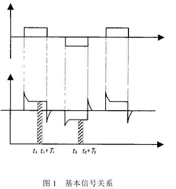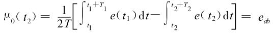 ②正負勵磁下的同相位采樣。圖1 是對應低頻矩形波勵磁形式下的典型電勢信號形式,按上述關(guān)系在一個勵磁周期下 ,若假設 t 1 和 t 2 點為工頻干擾的等效干擾點 , 且采樣寬度 T =T 1 =T 2 ,則 e ab 的基本算式為