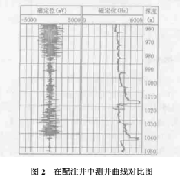 圖2是在中40-PXX配注井中的測井曲線。測試條件是儀器在油管和配注工具內(nèi)居中測井。左側(cè)是原磁性定位曲線,測井速度90m/h,曲線干擾嚴(yán)重,無法辨別出接箍和工具的設(shè)置情況。右側(cè)是更換后的接箍曲線,測井速度1200m/h,在 997m以上是油管段,各接箍位置清楚,在997m以下是工具段,各工具顯示清楚。在1006m~1007m和1032m~1034m兩處是Φ114mm封堵器;在1016m~1018m和1043m~1045m兩處分別是Φ54mm和Φ56mm的配水器短接,因其內(nèi)徑小而幅度高;1018m~1023m是5個配接短接。