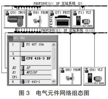 (1)電氣元件組態(tài)。把增加的質(zhì)量流量計和變頻器添加到香料廚房 S7-400 PLC 控制系統(tǒng)的 PROFIBUS 網(wǎng)中,其網(wǎng)絡(luò)組態(tài)如圖 3 所示,圖中 PROFIBUS-DP 地址 88 和 89 為硬件系統(tǒng)增加的質(zhì)量流量計和變頻器。