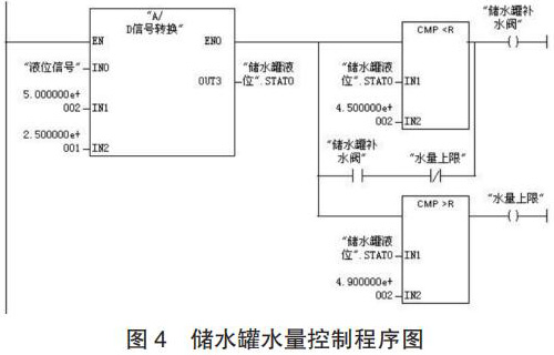 (2)程序設(shè)計。儲水罐水量控制的工作過程為:當(dāng)壓力變送器檢測到儲水罐的水量低于 450kg 時,補(bǔ)水閥 3 開啟為儲水罐補(bǔ)水;當(dāng)水量達(dá)到 490kg 時,補(bǔ)水閥 3 關(guān)閉;生產(chǎn)配制過程中,循環(huán)以上控制過程。儲水罐水量控制的程序如圖 4 所示。