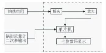 要想得到準確的流量數據,就必須不斷地在線檢測出運行工況下的溫度,進行溫度補償。安裝鍋街流量計的同時配套使用的DTB液流量計溫度補償器。DTB 液氨流量計溫度補償器安裝電原理方框圖(如圖1),其中虛線框內為DTB溫度補償器部分。